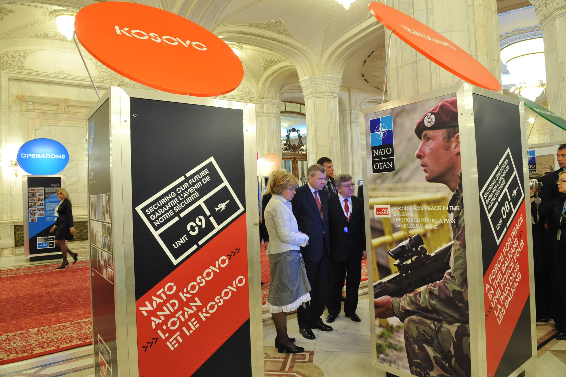 Walk about at the exhibit "Securing our Future" - From left to right: Mrs. De Hoop Scheffer and NATO Secretary General, Jaap de Hoop Scheffer; Corneliu Dobritoiu, State Secretary and Chief of Department for Policy of Defence and Planning (Photo: NATO)