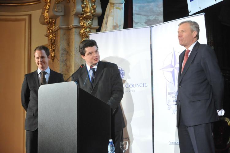 From left to right: Harald Thorud, Delegate to the Youth Summit; Alex Serban, Executive President of the Euro-Atlantic Council Romania and NATO Secretary General, Jaap de Hoop Scheffer (Photo: NATO)