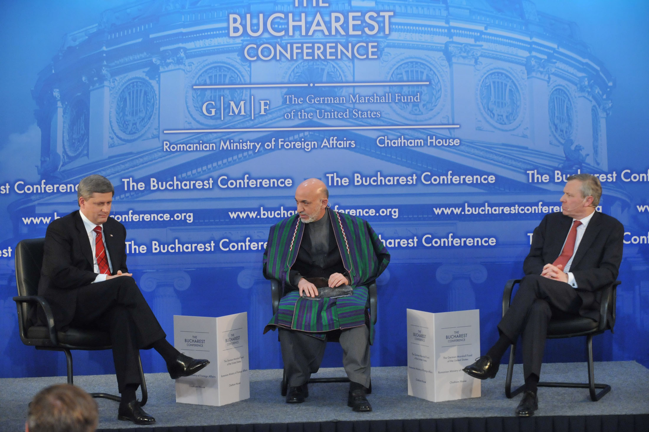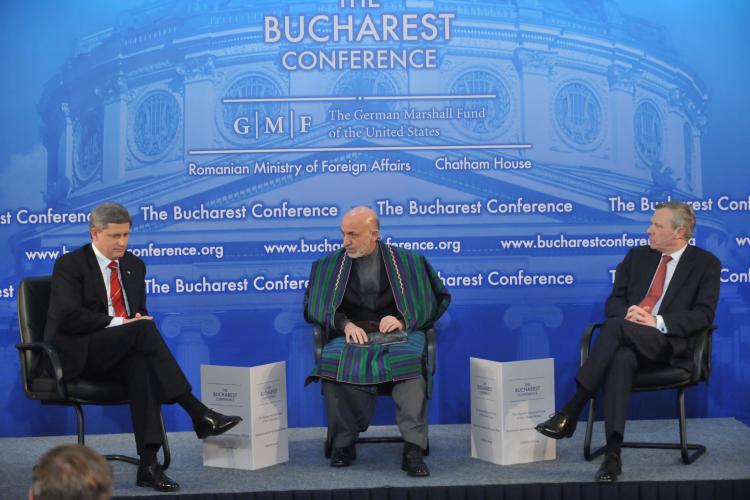 Panel intervention. From left to right: the Honourable Stephen Harper, Prime Minister of Canada; President Hamid Karzai of Afghanistan and NATO Secretary General, Jaap de Hoop Scheffer (Photo: NATO)
