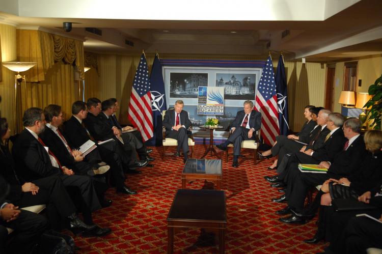 Bilateral meeting with NATO Secretary General Jaap de Hoop Scheffer and US President George Bush (Photo: NATO)