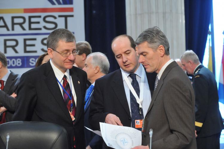 From left to right: Boguslaw Winid, NATO Permanent Representative for Poland; Sorin Dumitru Ducaru, NATO Permanent Representative for Romania and Ted Whiteside, NATO Secretary of the Council (Photo: NATO)