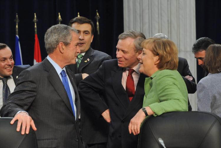 From lef to right: US President George Bush, Mikheil Saakashvili, President of Georgia; NATO Secretary General Jaap de Hoop Scheffer and Angela Merkel, Federal Chancellor of Germany (Photo: NATO)