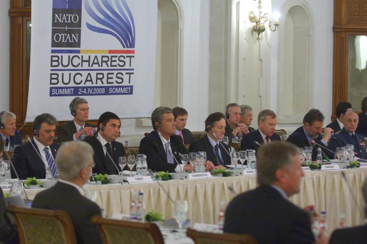 From left to right: Abdullah Gül, President of Turkey, Gourbanguly Berdymuhammedov, President of Turkmenistan, Viktor Yushchenko, President of Ukraine, NATO Deputy Secretary General, Claudio Bisogniero and NATO Secretary General, Jaap de Hoop Scheffer (Photo: NATO)