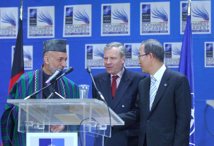From left to right: President Karzai of Aghanistan, NATO Secretary General Jaap de Hoop Scheffer and UN Secretary General Ban Ki-Moon (PHOTO: NATO)