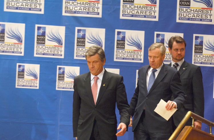 Victor Yuschenko, President of Ukraine and NATO Secretary General Jaap de Hoop Scheffer enter the press theatre(Photo: NATO)